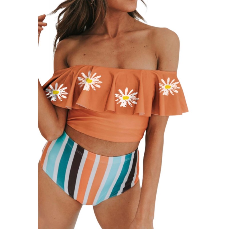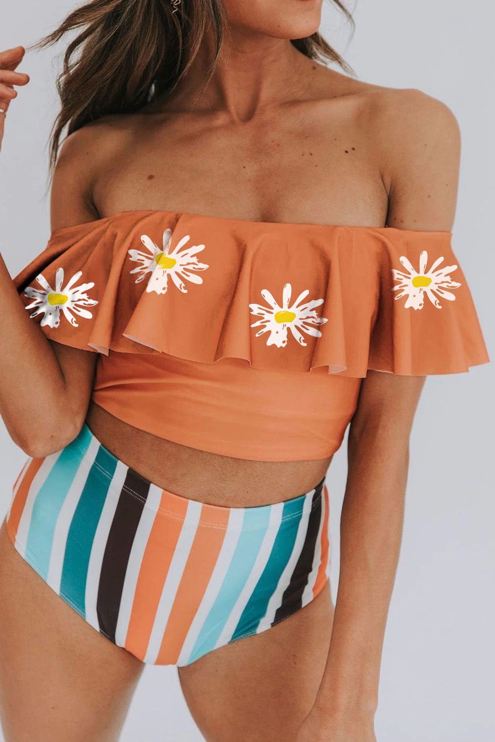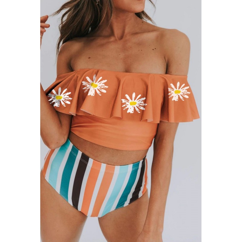 Ruffles Overlay Off Shoulder Top and Striped Panty Bikini