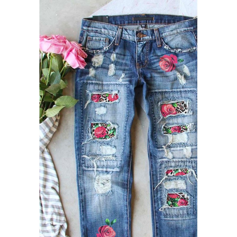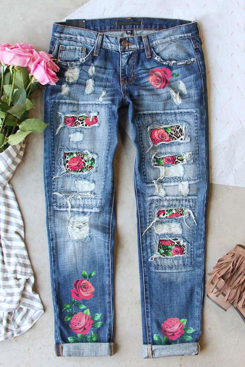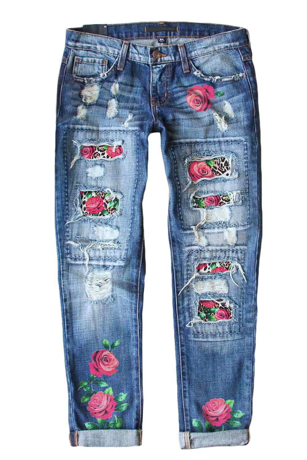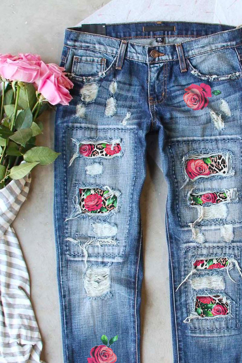 Cheetah Floral Print Contrast Mid Waist Distressed Jeans