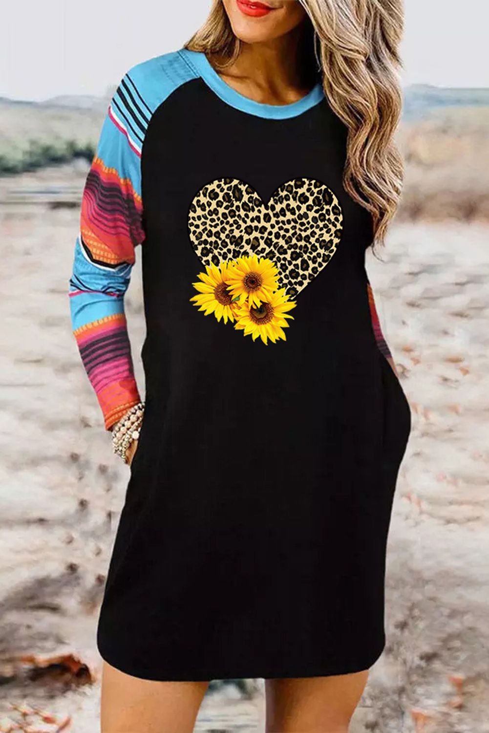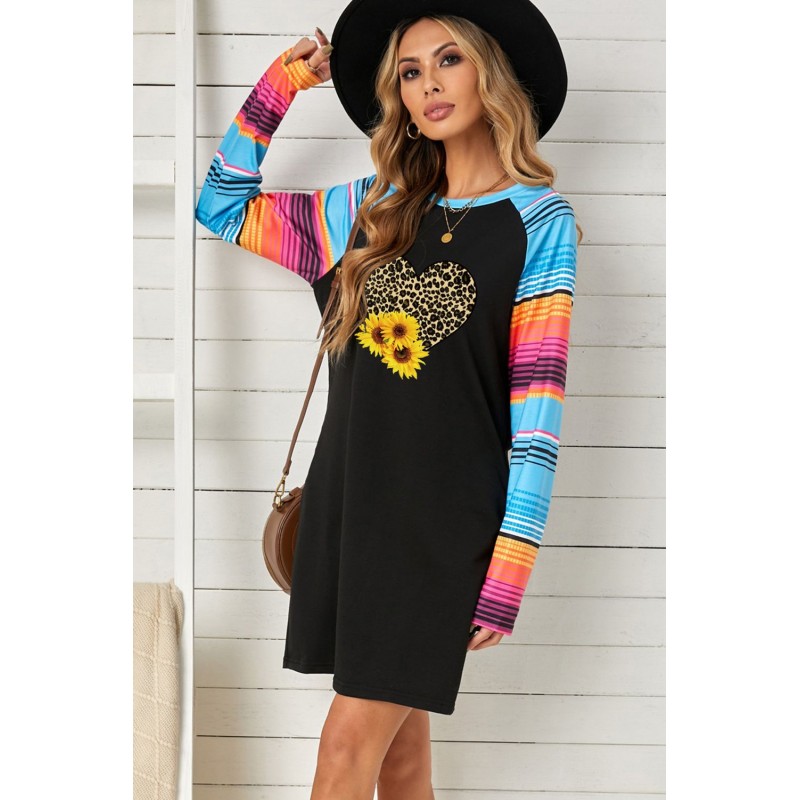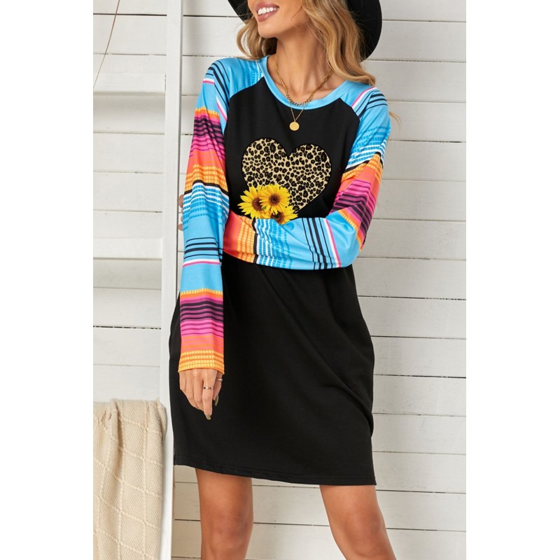 With the striped print raglan sleeve, leopard heart and sunflowers print on the frontShift dress with long sleeve and crew neck can better shape your body curveMade of soft, durable and breathable material to ensure wearer's comfortable wearThe dress with above knee length can perfect show off your long and slender legsGraphic dresses wholesale are perfect for home, office, date, party, shopping