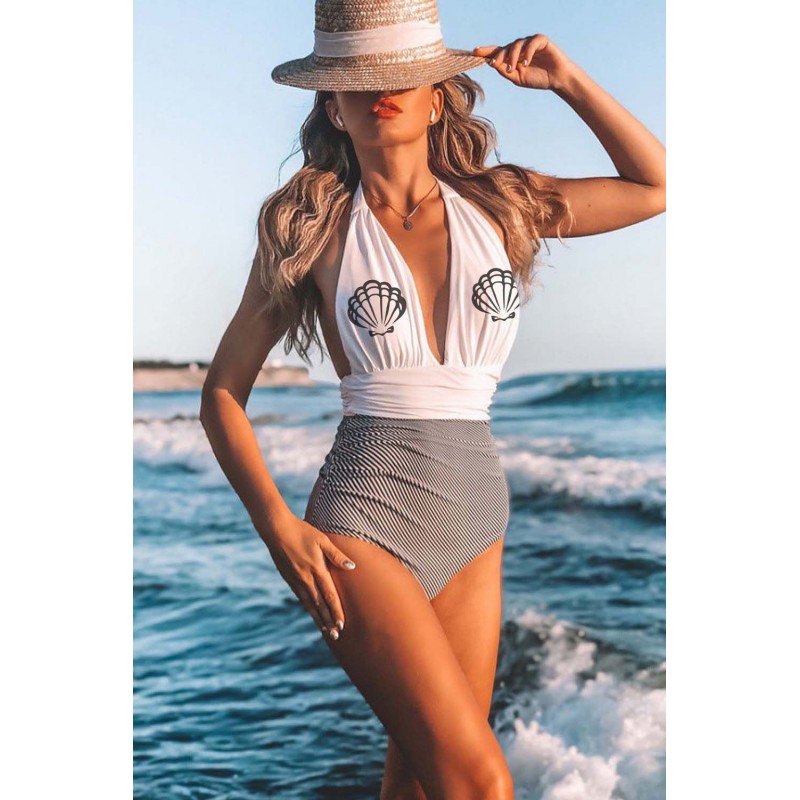 Pattern Striped Print Halter Deep V Neck Backless One-piece Swimsuit