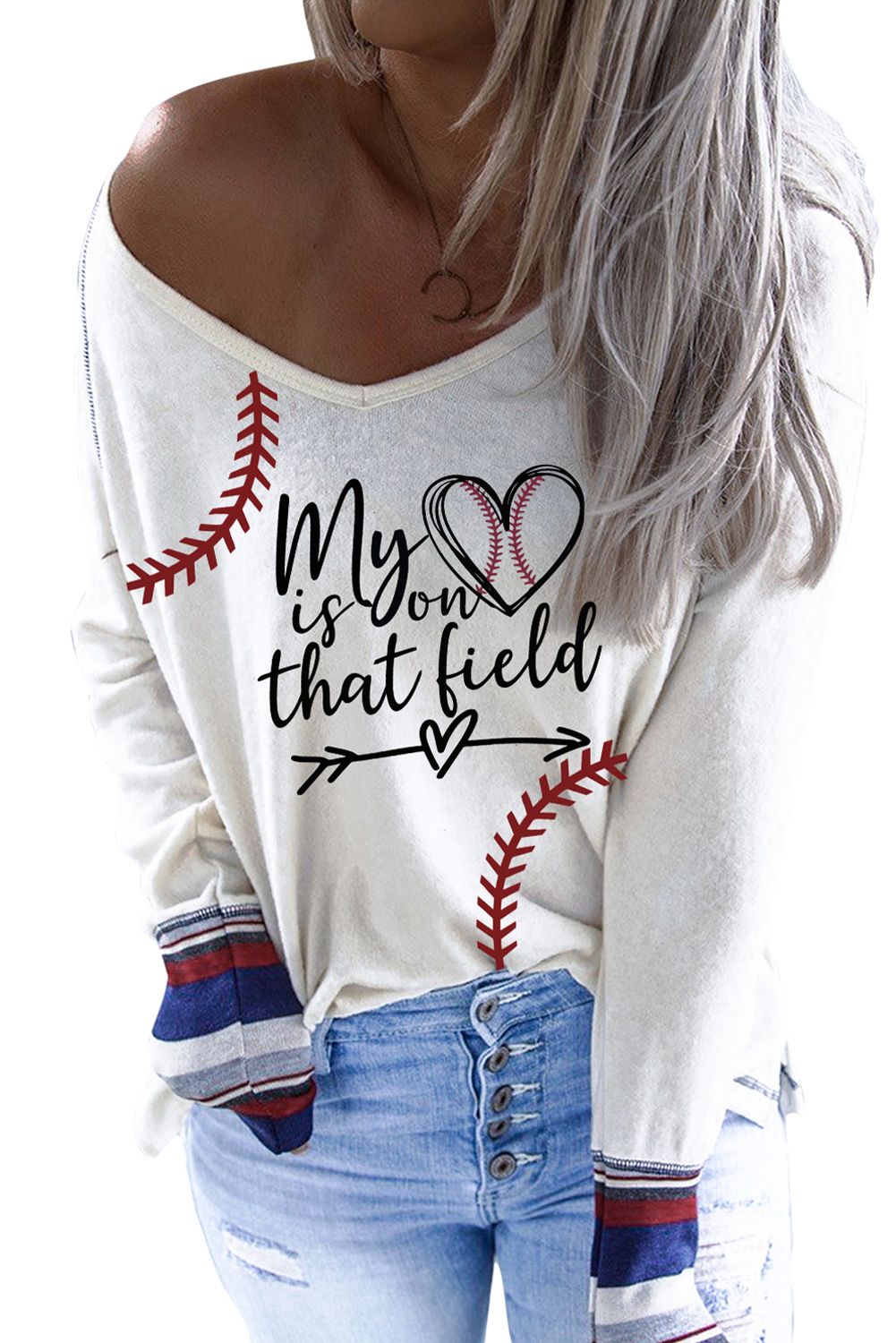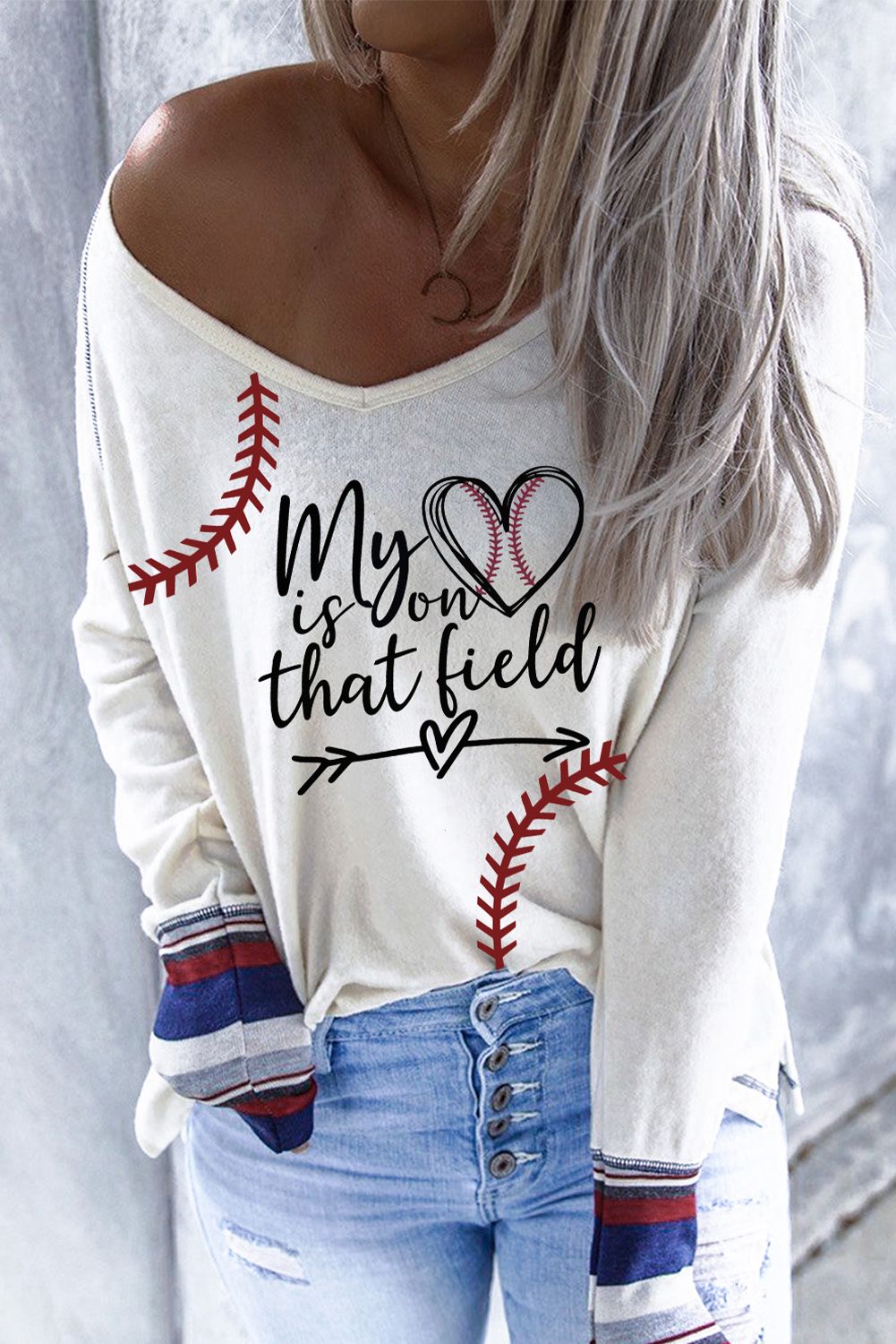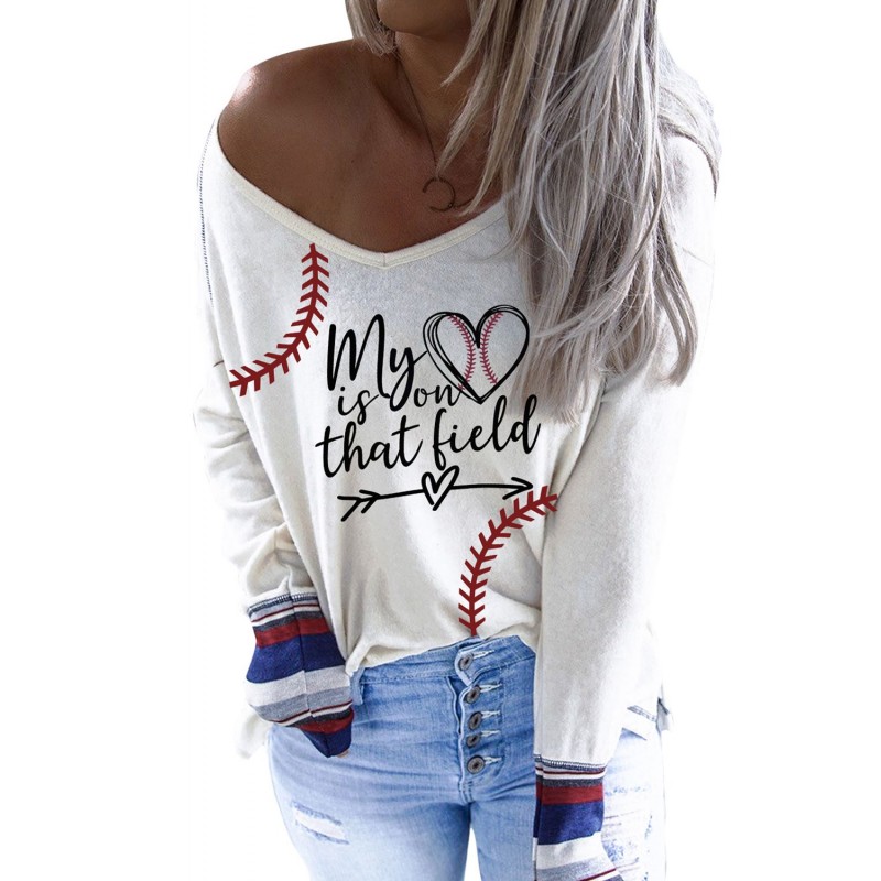 Baseball Print V Neck Long Sleeve Top