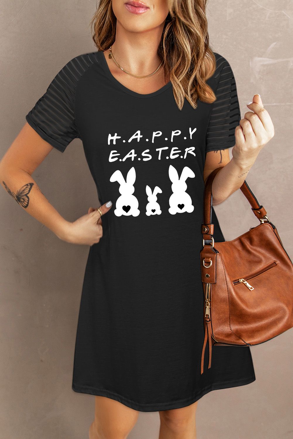 Black Happy Easter Bunny Print Short Sleeve Mini Dress
