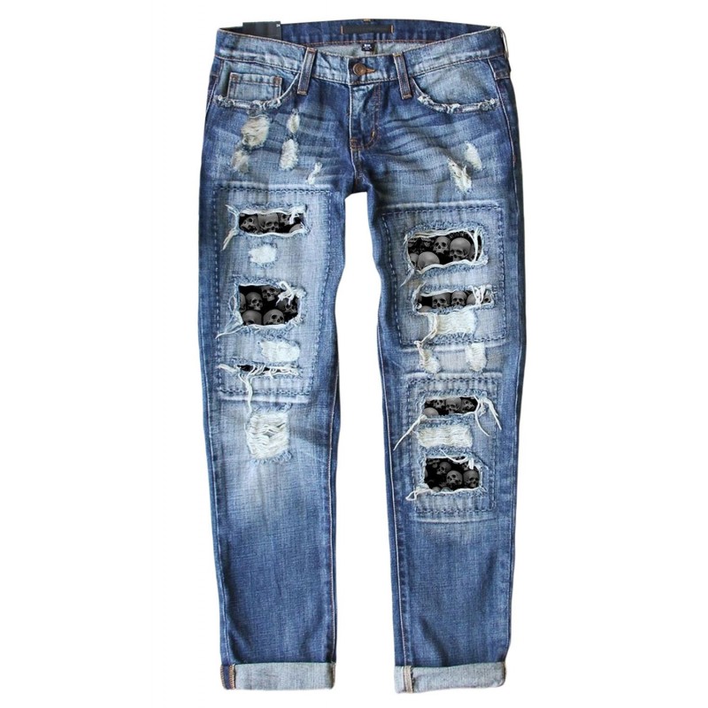 Sky Blue Casual Skeleton Patchwork Print Ripped Jeans