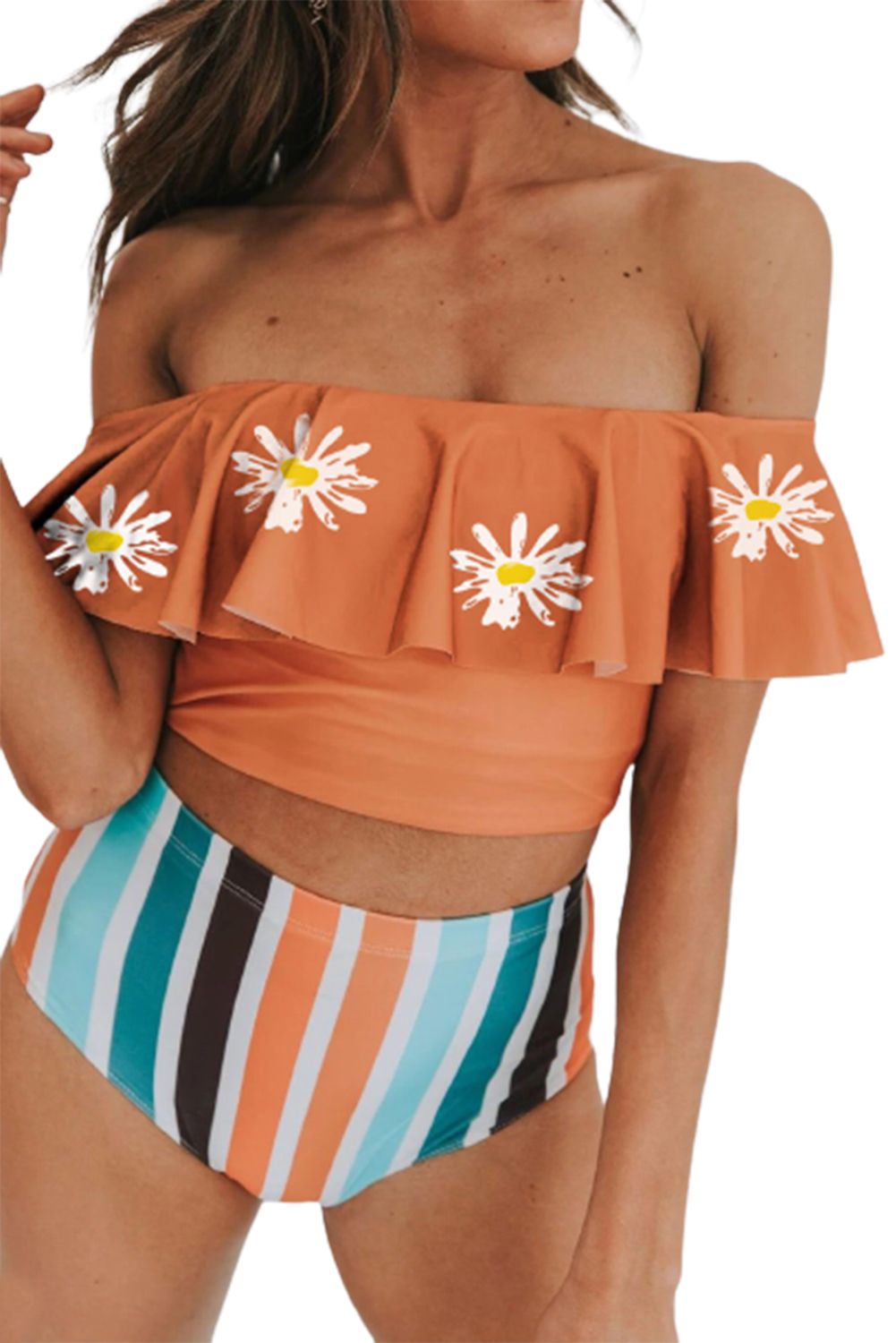 Ruffles Overlay Off Shoulder Top and Striped Panty Bikini