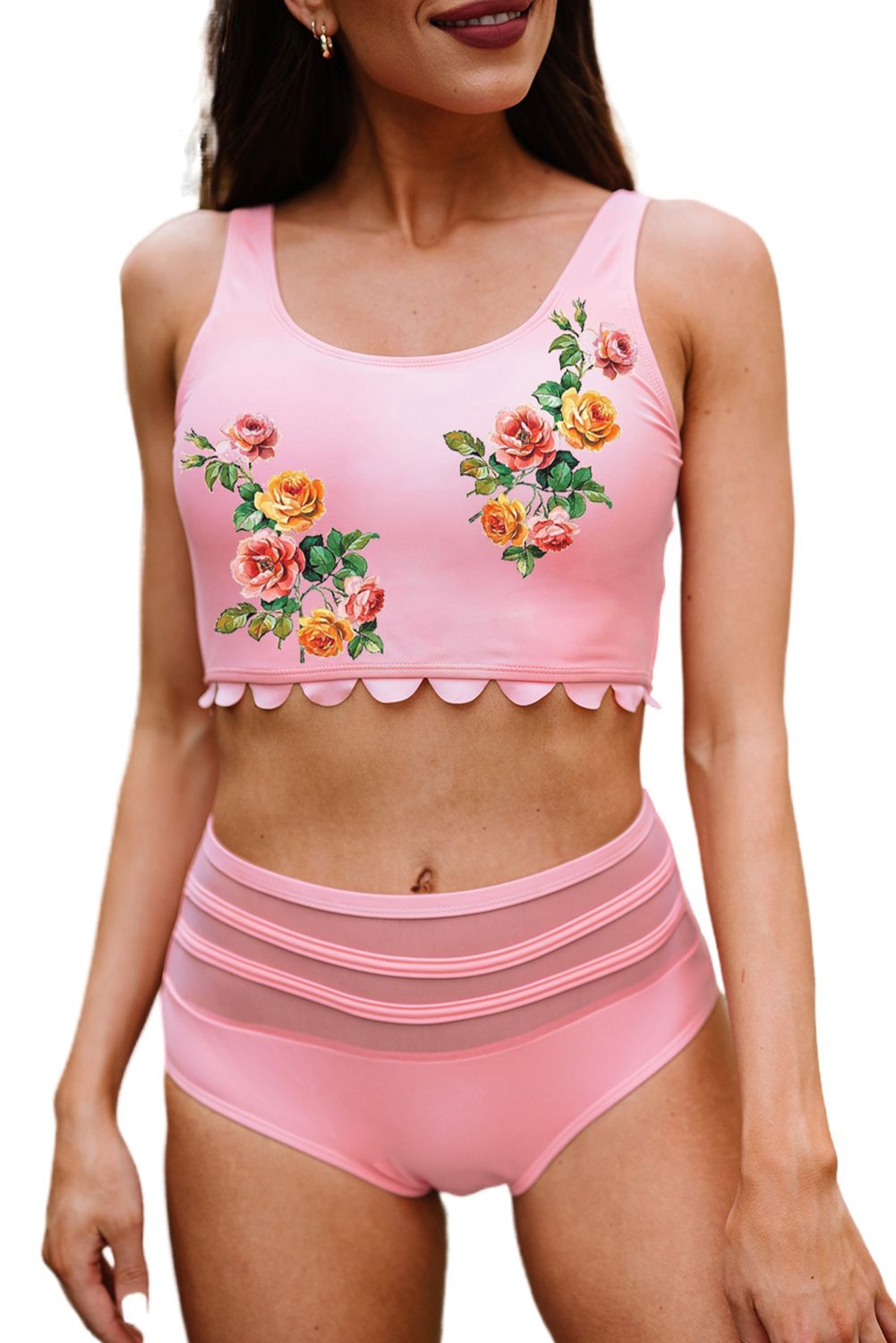 Pink Floral Print Scalloped Sleeveless High Waist Bikini Swimsuit