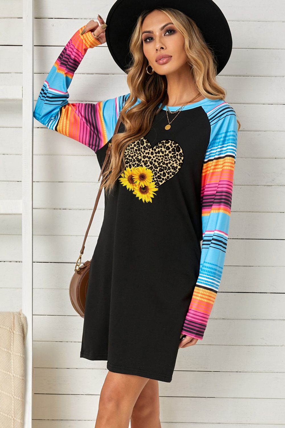 With the striped print raglan sleeve, leopard heart and sunflowers print on the frontShift dress with long sleeve and crew neck can better shape your body curveMade of soft, durable and breathable material to ensure wearer's comfortable wearThe dress with above knee length can perfect show off your long and slender legsGraphic dresses wholesale are perfect for home, office, date, party, shopping