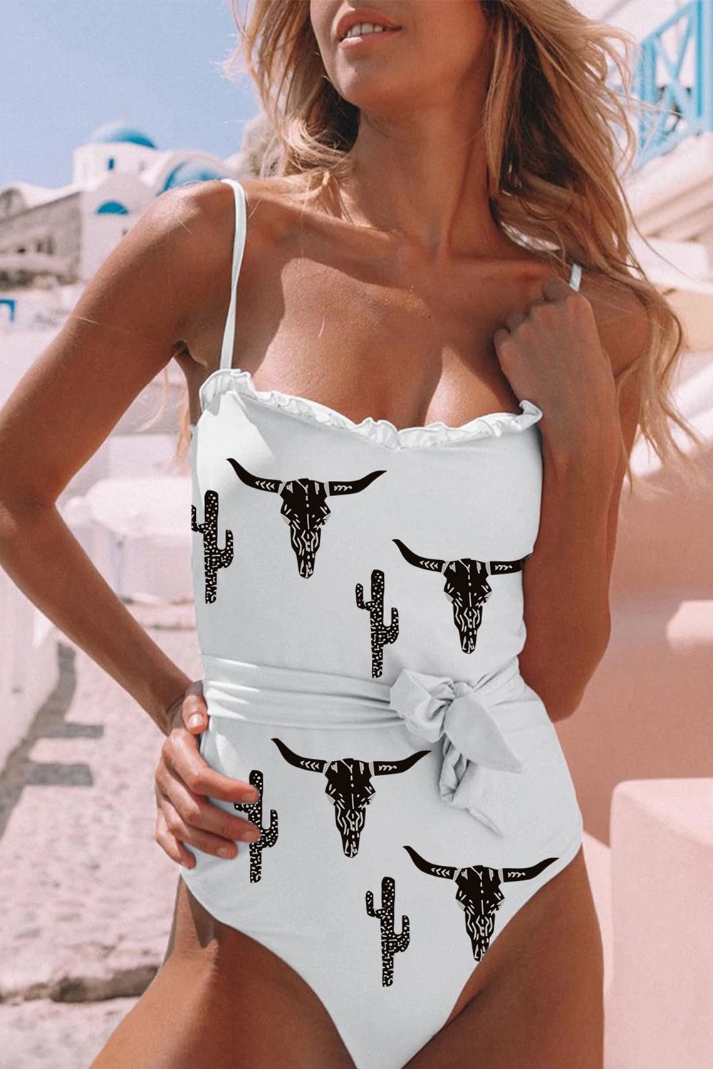 Western Graphic Print Frilled Lace-upOne-piece Swimwear