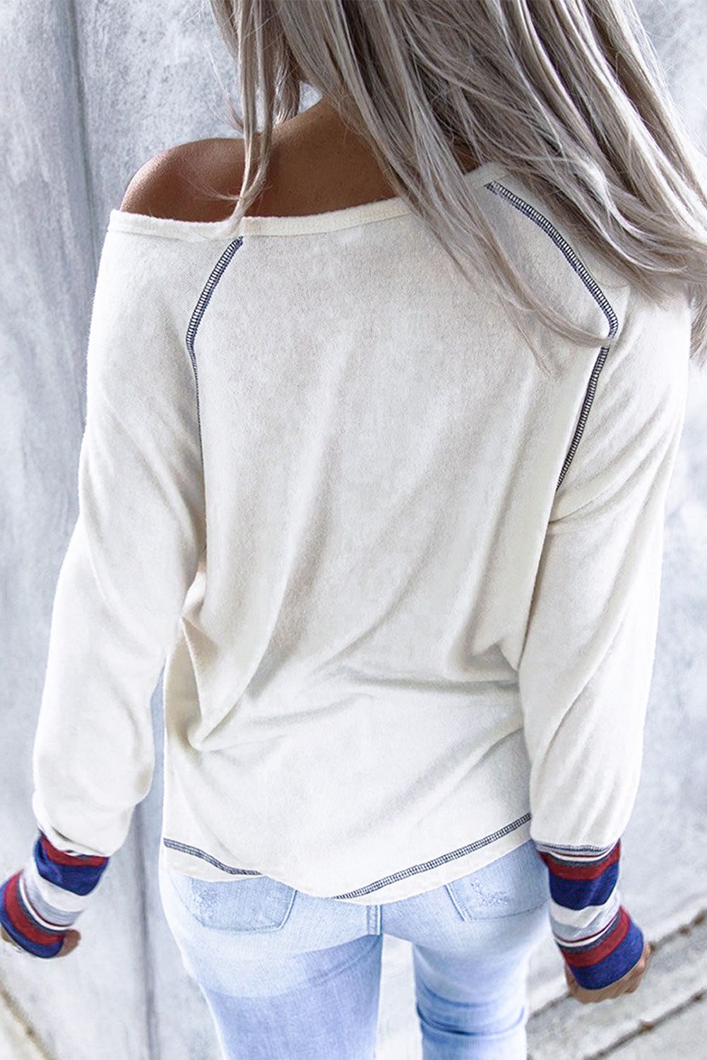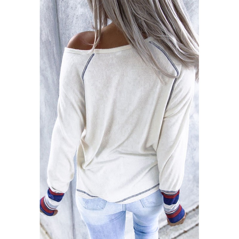 Beige Baseball Print V Neck Long Sleeve Top