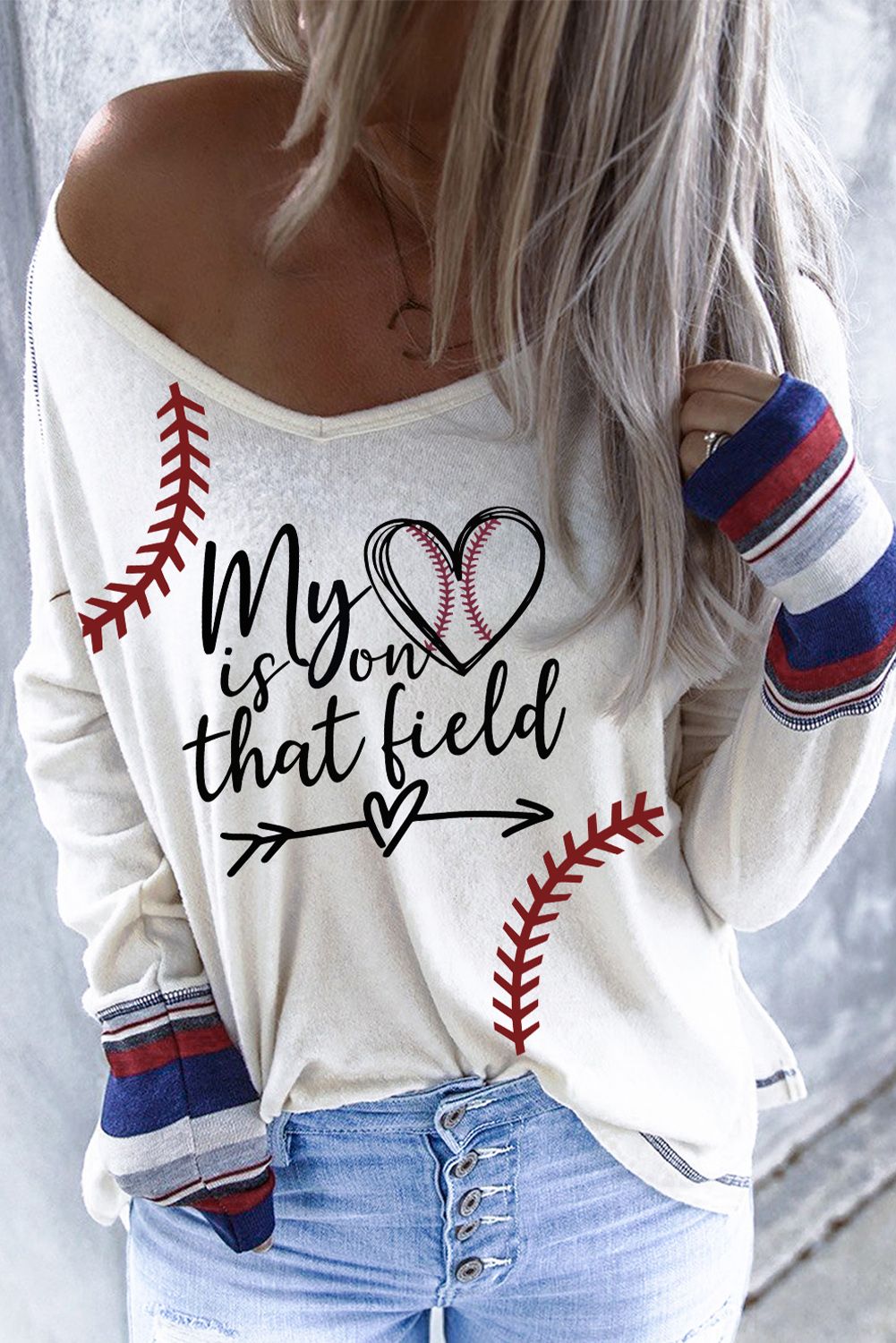 Baseball Print V Neck Long Sleeve Top