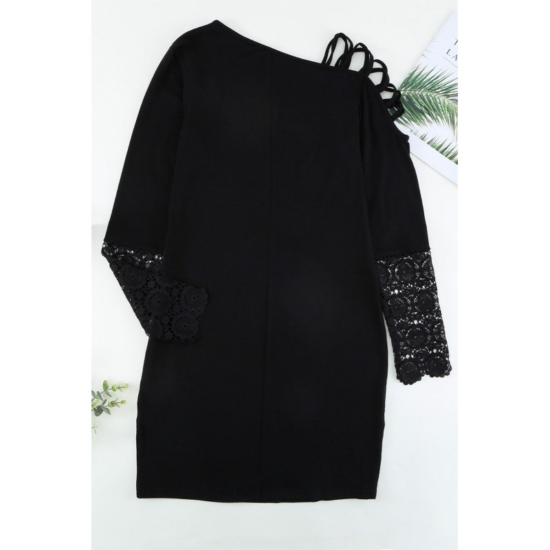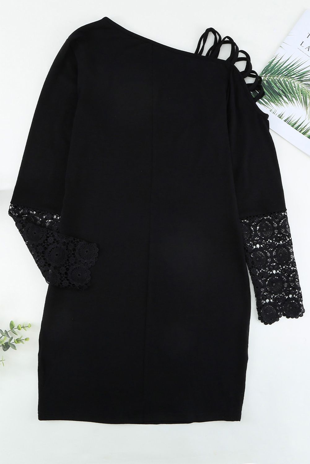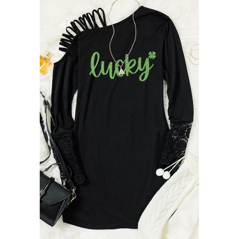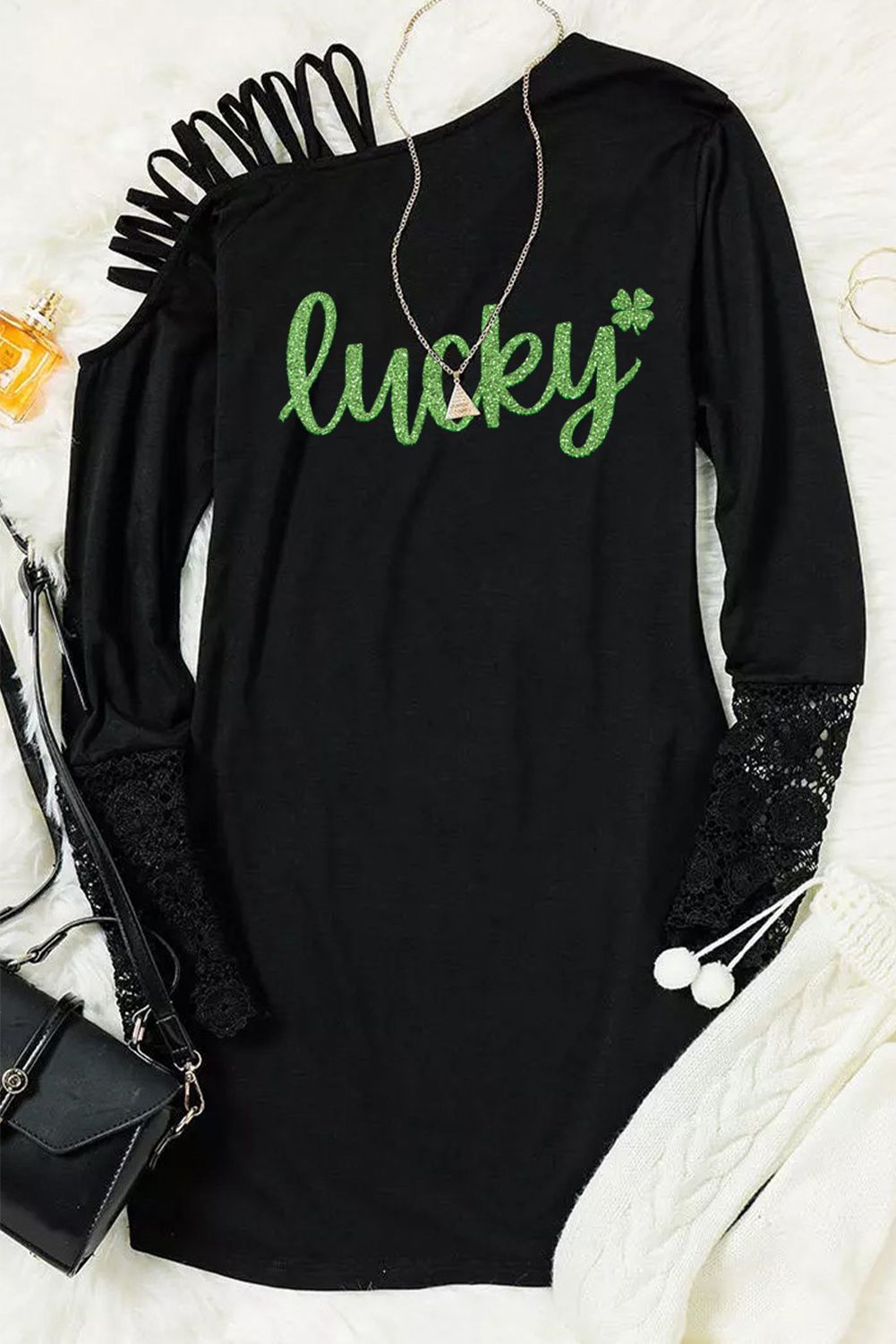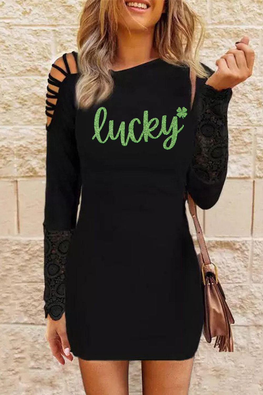 Black Lucky Clover Print Cut-out Lace Patchwork Long Sleeve Mini Dress